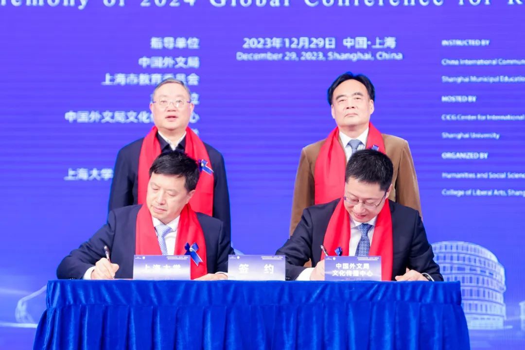 刘昌胜校长与张金庭主任签署共建协议,陆彩荣副局长、成旦红书记见证,并共同为“文化传播创新合作基地·上海中心”揭牌。基地的建立旨在深入贯彻落实习近平总书记关于文化建设和国际传播工作的一系列重要论述精神,更好履行外文局“提升中华文化国际影响力”核心使命,推动中华文化海外传播。