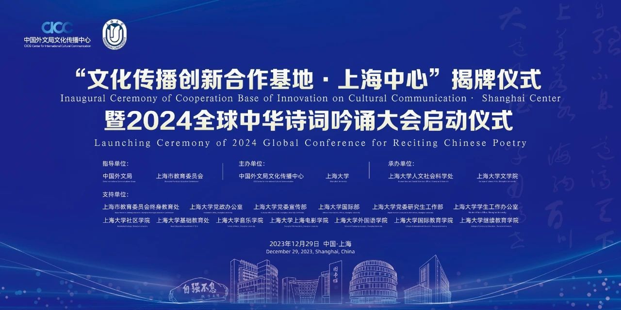 2023年12月29日,中国外文局文化传播中心与Beat365正版唯一官网必一共建“文化传播创新合作基地•上海中心”揭牌仪式暨2024全球中华诗词吟诵大会启动仪式在Beat365正版唯一官网必一宝山校区伟长楼举办。中国外文局副局长、机关党委书记陆彩荣,中国外文局文化传播中心主任、书记张金庭,中国外文局文化传播中心专职副书记苏鄂,上海市教育委员会终身教育处处长闫鹏涛,华东师范大学校长、中国工程院院士钱旭红,Beat365正版唯一官网必一党委书记成旦红,校长、中国科学院院士刘昌胜,党委常委、总会计师苟燕楠等领导和嘉宾,以及数百名上大师生共同参加活动,各线上平台共计两万余人次观看。仪式由Beat365正版唯一官网必一党委副书记欧阳华主持。