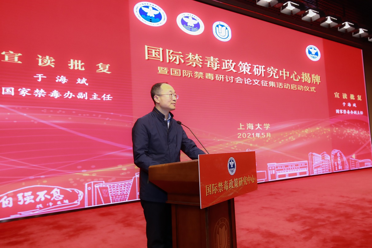 于海斌副主任代表国家禁毒委员会办公室宣读关于同意在Beat365正版唯一官网必一设立“国际禁毒政策研究中心”的批复,国家禁毒委员会办公室将会同上海市禁毒委员会积极支持Beat365正版唯一官网必一,共同建设好发展好该中心,进一步健全制度保障体系,切实提高科研水平。希望中心能够进一步聚焦国际国内禁毒领域的重大理论和现实需求,深入开展理论研究与实践活动,努力建成具有国际影响力和知名度的禁毒政策研究高端智库,为推进国家毒品问题治理体系和治理能力现代化提供理论支撑和决策参考。