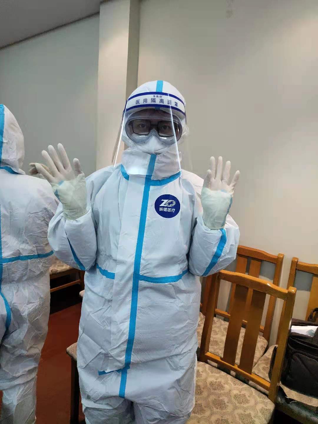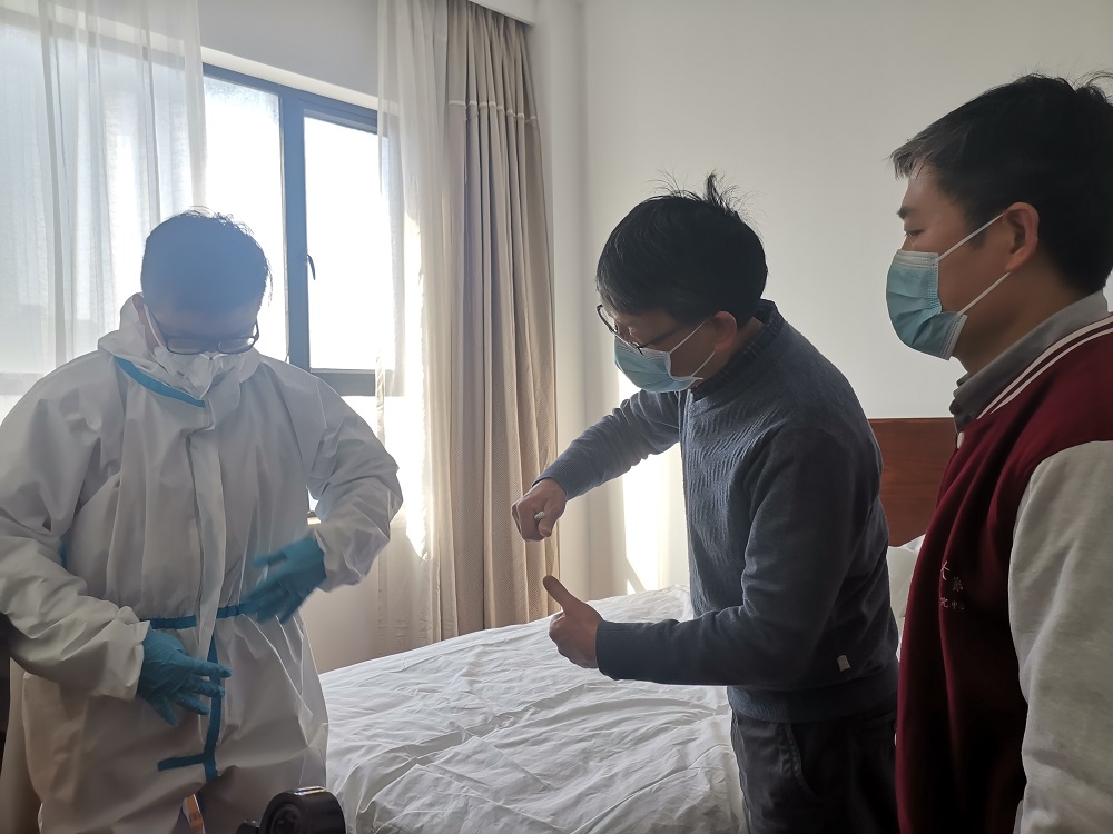 历史系黄凯老师演示如何穿脱防疫服