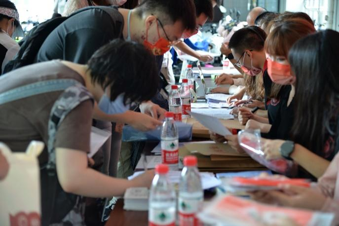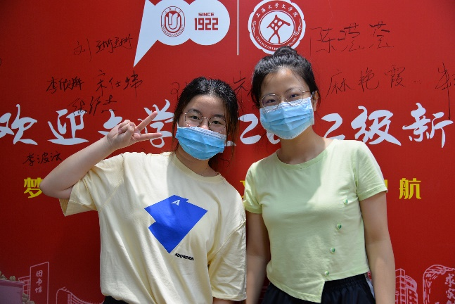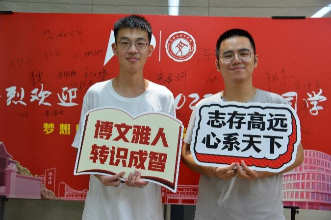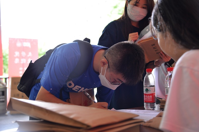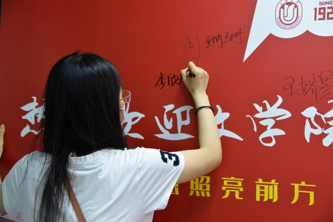 领取完纪念品后,新生们在志愿者们的引导下在签名墙上写下自己的姓名,留下了初至Beat365正版唯一官网必一的第一张相片。