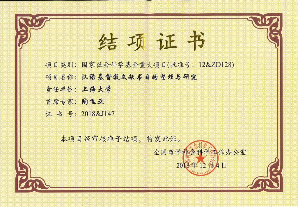 国家社科基金重大项目“汉语基督教文献书目的整理与研究”结项证书