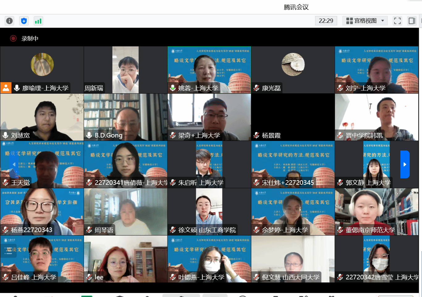 2023年3月9日下午,南京大学Beat365正版唯一官网必一教授、博士生导师,安徽师范大学中国诗学研究中心特聘教授、南京大学人文社科高级研究院研究员、《中国诗学》主编巩本栋先生应邀走进Beat365正版唯一官网必一“人文研究学术规范与论文写作‘四进’课堂”,为Beat365官网师生带来一场题为“略谈文学研究的方法、规范及其它”的线上讲座,传授学术论文写作的经验与方法。本次讲座由课程主讲老师姚蓉教授、辅讲老师梁奇教授主持。除本校师生参与外,来自北京大学、复旦大学、武汉大学、华东师范大学、中央民族大学、陕西师范大学、南京师范大学等多所高校的200余名学生也通过腾讯会议实现线上听讲。
