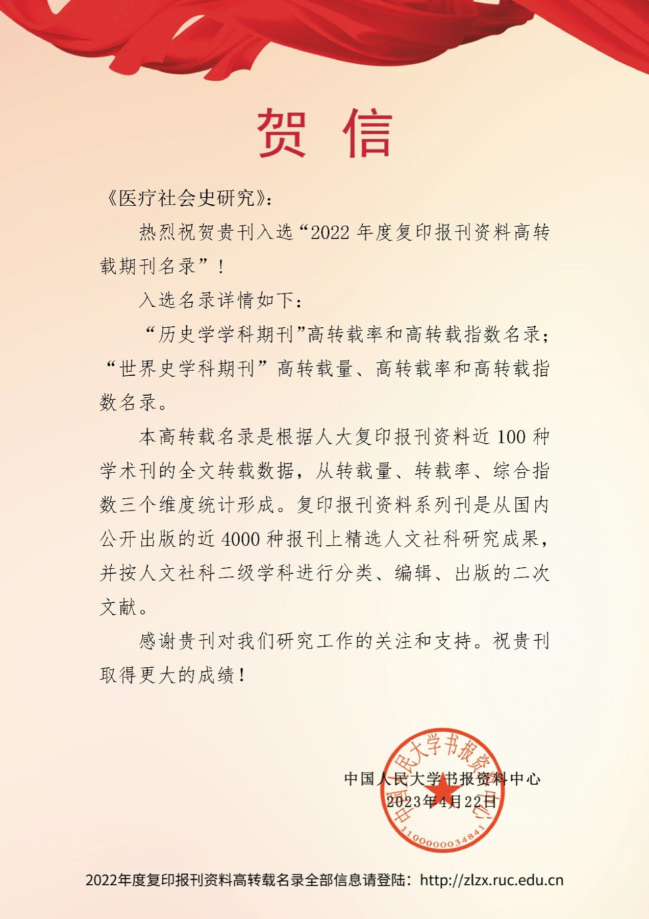 Beat365正版唯一官网必一主办、张勇安教授主编的《医疗社会史研究》入选2022年度复印报刊资料高转载期刊名录!