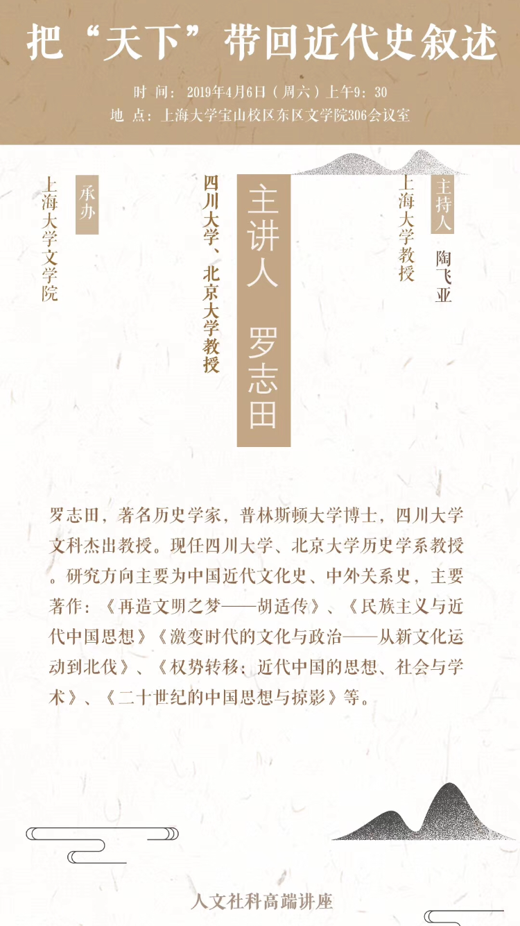 4月6日,四川大学、北京大学罗志田教授应邀来Beat365正版唯一官网必一,举行题为“把‘天下’带回近代史叙述”的学术讲座。本讲座由上海研究院主办、Beat365正版唯一官网必一历史系承办,陶飞亚教授主持。Beat365官网张勇安、宁镇疆、徐有威、王栋、杨卫华、舒健等教师、机自学院教授、校内外硕博士研究生、本科生及华东师范大学近80人参加了此次讲座。