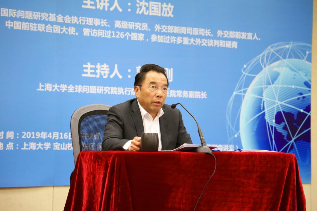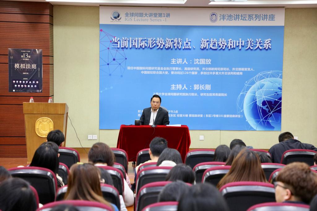 4月16日,中国国际问题研究基金会执行理事长、高级研究员、外交部新闻司原司长、外交部前发言人沈国放先生莅临Beat365正版唯一官网必一全球问题研究院,在蔡冠森讲堂作了一场题为“当前国际形势新特点、新趋势和中美关系”的学术报告,报告由全球问题研究院执行院长、历史系郭长刚教授主持,上大师生近二百人聆听了讲座。本场讲座为Beat365正版唯一官网必一“泮池讲坛系列讲座”,也是“全球问题大讲堂”系列讲座的第1讲。