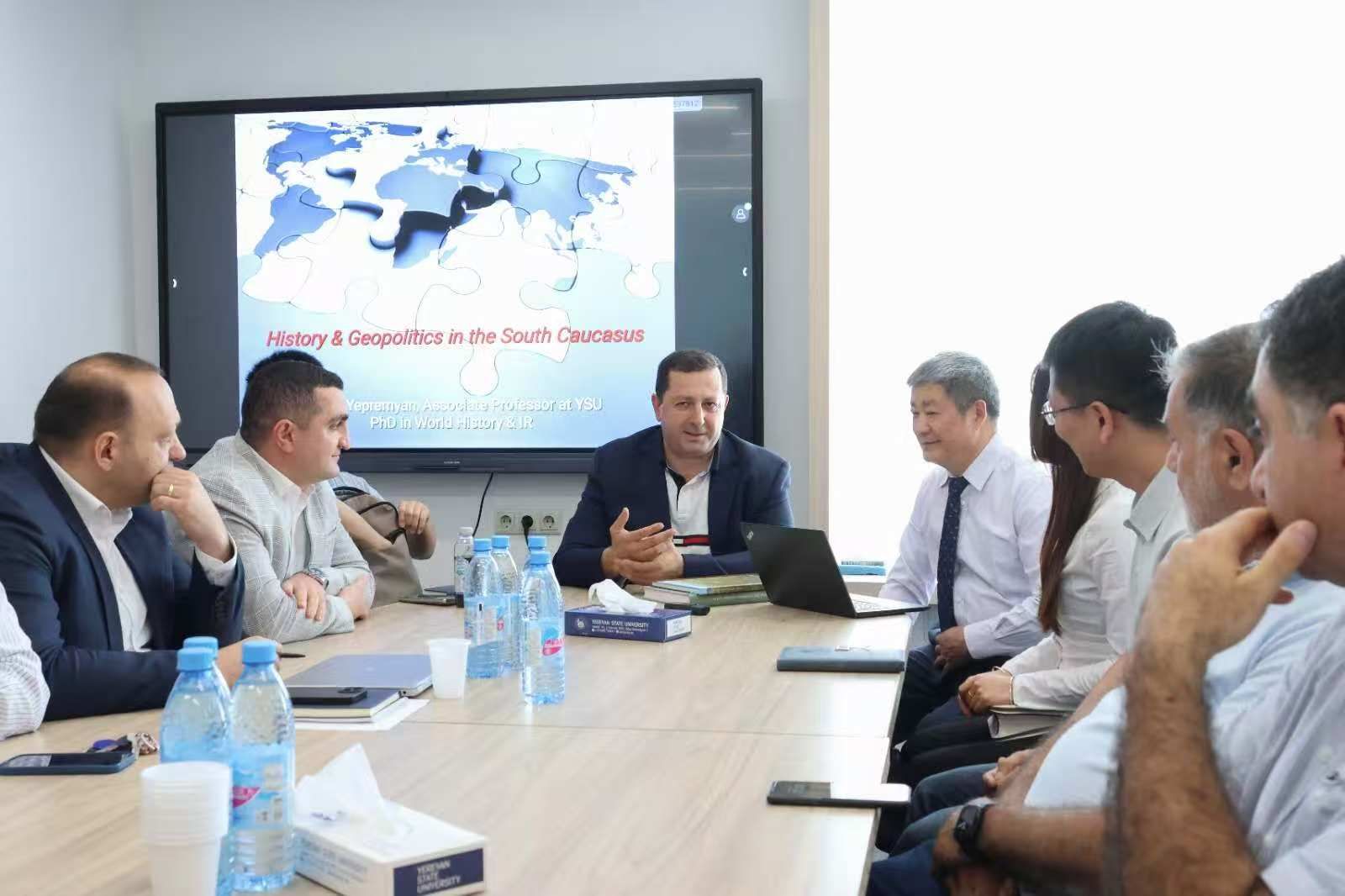 19日,代表团访问亚美尼亚埃里温国立大学,该校校长霍夫汉内斯·霍夫汉尼斯扬教授接见了代表团一行。双方就未来在学术研究、人才培养以及文化交流等方面的合作进行探讨。代表团还与埃里温国立大学历史学、政治学、考古学教师联合举行“南高加索历史与地缘政治”工作坊,围绕南高加索地区的历史演变、地缘政治格局以及该地区与中国在经济、文化、政治等领域的关系等议题展开深入讨论。