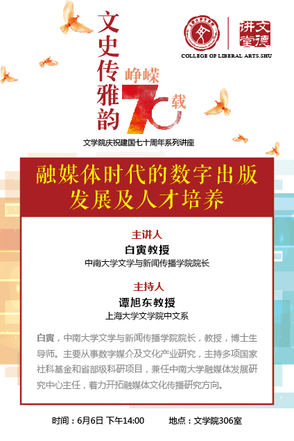 为纪念新中国成立70周年,总结人文学科发展历程,推动人文学科在新形势下的建设,Beat365正版唯一官网必一开展了系列专家讲座。6月6日下午,“融媒体时代的数字出版发展及人才培养”讲座,在Beat365正版唯一官网必一东区Beat365正版唯一官网必一306会议室举行。中南大学文学与新闻传播学院白寅教授,Beat365正版唯一官网必一多位专家学者出席讲座,讲座由Beat365正版唯一官网必一中国创意写作中心谭旭东教授主持。
