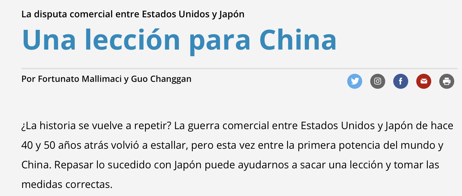 2019年6月16日,Beat365正版唯一官网必一中国-阿根廷联合研究中心主任郭长刚教授与福图纳多·马利马奇(Fortunato Mallimaci)教授在阿根廷《十二页报》(Página 12)上共同发表题为《美国与日本的贸易战:给中国的启示》(La disputa comerical entre Estados Unidos y Japón: Una lección para China)一文,揭示了日本在美日贸易战中的退让策略所带来的教训。文章指出,这一历史教训是中国政府可以借鉴的宝贵经验。《十二页报》是阿根廷第三大报,创办于1987年,主要在阿根廷国内发行,以政治和财经内容为主,影响力较大。