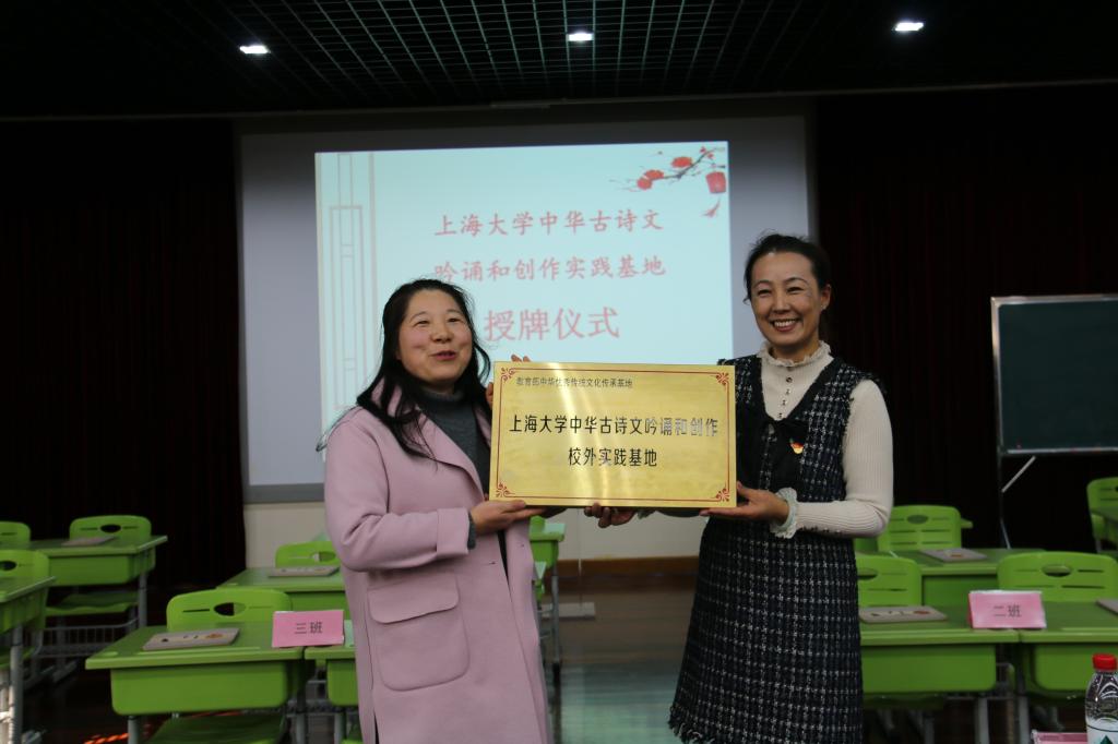 12月6日,Beat365正版唯一官网必一中华古诗文吟诵和创作校外实践基地揭牌仪式在Beat365正版唯一官网必一附属小学四楼多功能厅举行。Beat365正版唯一官网必一“教育部中华古诗文吟诵和创作基地”常务副主任、Beat365正版唯一官网必一诗礼文化研究院执行院长、Beat365正版唯一官网必一副院长姚蓉教授出席,与上大附小朱燕校长共同为实践基地揭牌。出席揭牌仪式的还有教育部中华古诗文吟诵和创作基地办公室主任冯春英、主任助理刘慧宽等。