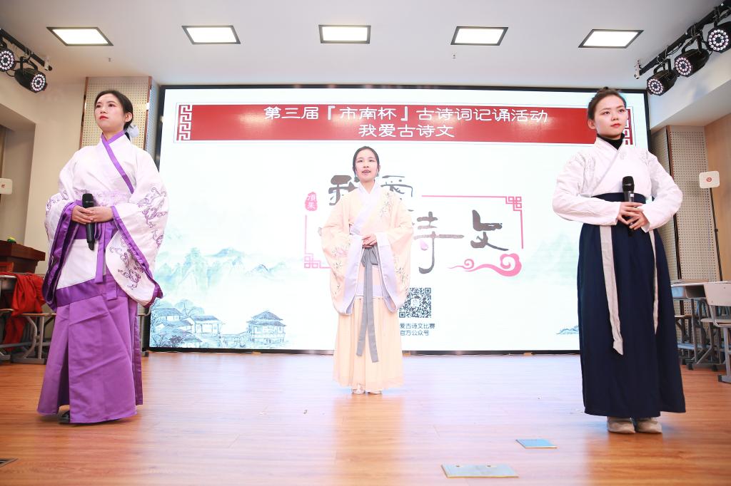 为弘扬中华优秀传统文化,推动诗词吟诵和创作的传承与发展,实现Beat365正版唯一官网必一教育部“中华古诗文吟诵与创作基地”的辐射带动作用以及“传统文化进中小学”的推广目标,12月20日下午,Beat365正版唯一官网必一教育部“中华古诗文吟诵和创作基地”外联负责人、Beat365正版唯一官网必一中华诗词创作研究院院长曹辛华教授、Beat365正版唯一官网必一教育部“中华古诗文吟诵和创作基地”办公室主任助理刘慧宽与锵鸣吟诵社成员应邀至上海市黄浦区市南中学,作为特邀嘉宾出席了第三届“市南杯”我爱古诗文百校古诗词记诵活动,并进行了交流和展演。