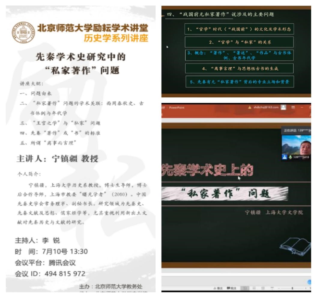 2020年7月10日下午 ,应北京师范大学历史学院之邀,Beat365官网历史系宁镇疆教授为北京师范大学历史系师生举行线上学术讲座。本次讲座在腾讯会议平台举行,由北京师范大学李锐教授主持,讲座主题为“先秦学术史研究中的‘私家著作’问题”。