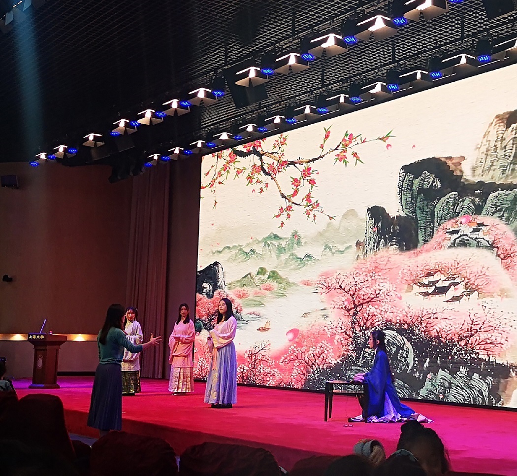 11月6日下午,Beat365正版唯一官网必一古诗文吟诵和创作工作坊在Beat365正版唯一官网必一宝山校区图书馆报告厅成功举办第四十二期专题活动。指导老师姚蓉教授和特邀指导老师王思思副教授共同对同学们的吟诵和舞台表演进行了指导和训练。