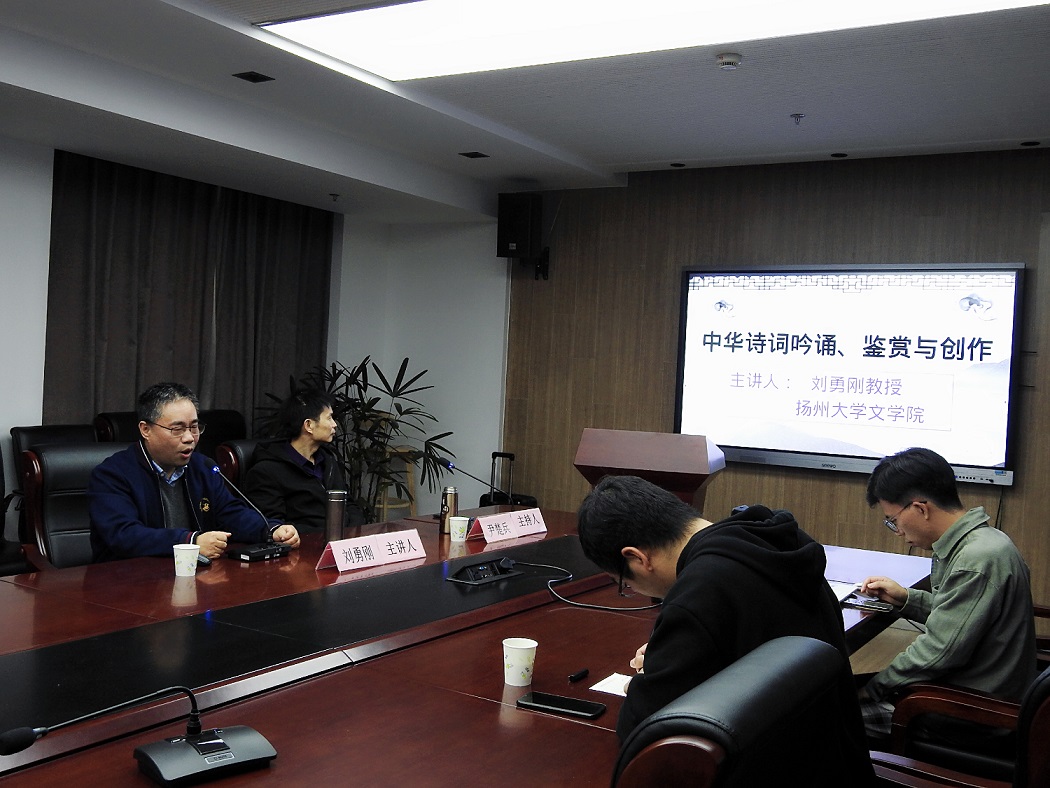 11月19日下午,扬州大学刘勇刚教授应“教育部中华古诗文吟诵和创作基地”之邀,在Beat365正版唯一官网必一306会议室作了一场题为“中华诗词吟诵、鉴赏与创作”的讲座。讲座由尹楚兵教授主持,除了在座数十位学生得以现场聆听外,来自不同学校的师生也通过腾讯会议的形式实现线上共享。