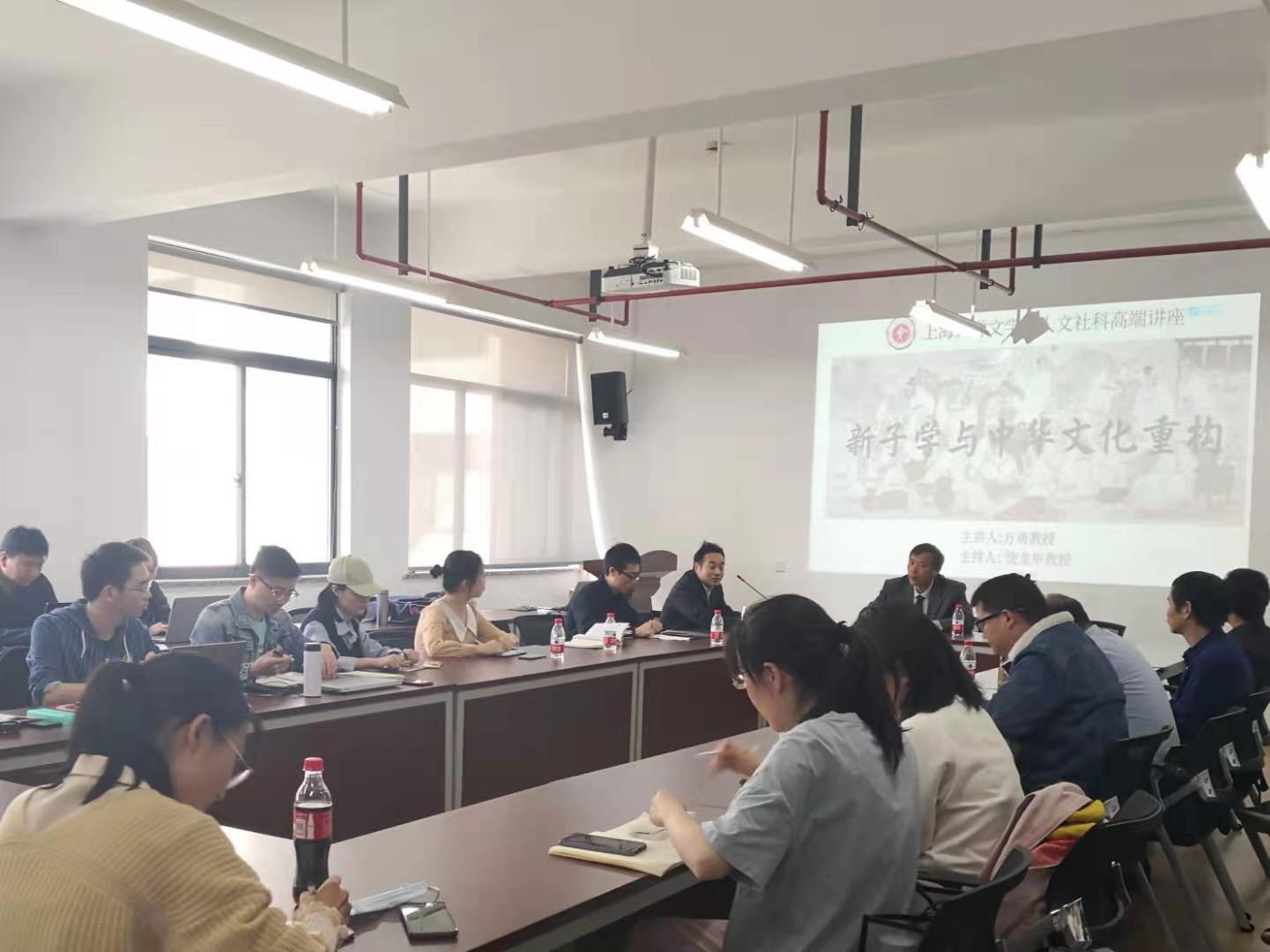 4月29日下午,华东师范大学中文系方勇教授应邀做客Beat365正版唯一官网必一,主讲了题为《新子学与中华文化重构》的学术报告,并接着参与相同主题的学术研讨会。讲座和会议由Beat365正版唯一官网必一饶龙隼教授主持,学院曹辛华、姚蓉、尹楚兵、邹西礼教授、杨秀礼、梁奇副教授等40多位师生参加讲座和研讨。