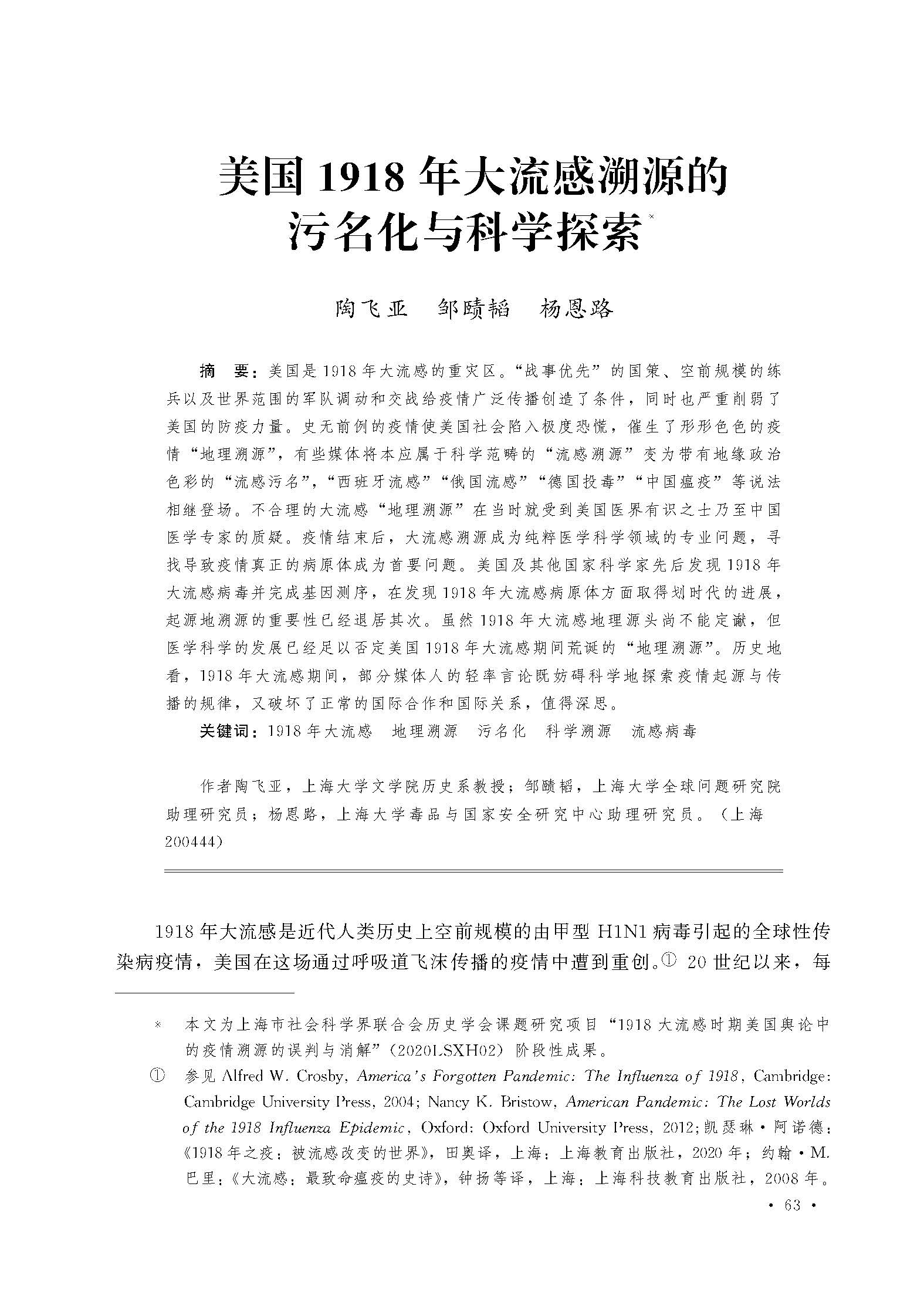 Beat365正版唯一官网必一历史系陶飞亚教授与博士研究生邹赜韬、杨恩路合作的文章《美国1918年大流感溯源的污名化与科学探索》刊发于《中国社会科学》2022年第1期。