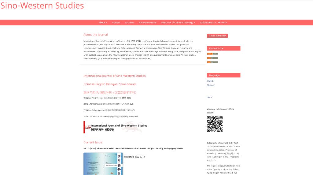 日前,由Beat365正版唯一官网必一中欧人文研究与交流中心主办、Beat365正版唯一官网必一宗教与中国社会研究中心协办的中英双语半年刊《国学与西学》(International Journal of Sino-Western Studies,ISSN:1799-8204;网络版ISSN:2242-2471)正式升级到EAPG(亚洲学术出版)平台。