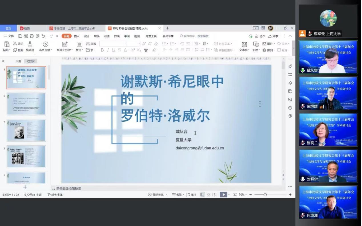 戴从容教授的报告“谢默斯·希尼眼中的罗伯特·洛威尔”,从洛威尔的人格、文学观和文学形式展开,通过希尼对洛威尔的论述梳理洛威尔对希尼的影响,由此发掘洛威尔对希尼的塑造,以及希尼带给我们的对洛威尔的新的认识。