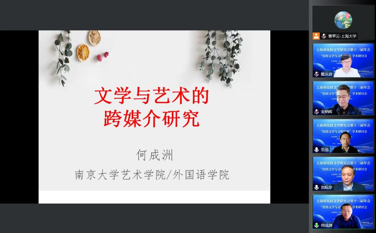 何成洲教授的报告“文学与艺术的跨媒介研究”,报告阐述了不同媒介的混合、跨媒介的指涉、跨媒介的改编以及跨媒介的表演性等问题。