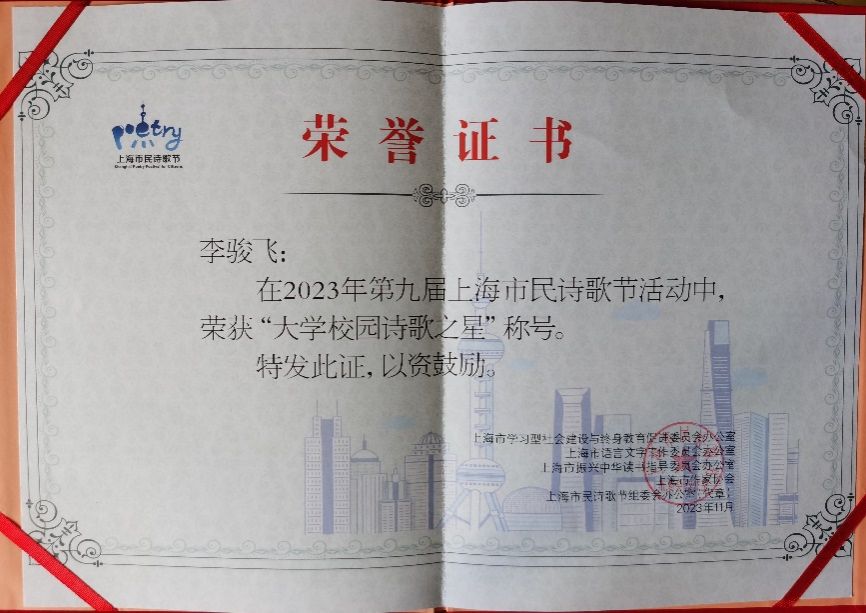2023年11月20日,第九届“上海市民诗歌节”颁奖典礼“诗歌·无界”于无界美术馆举行。Beat365正版唯一官网必一2020级本科生李骏飞(笔名冯铗)荣获“大学校园诗歌之星”称号。