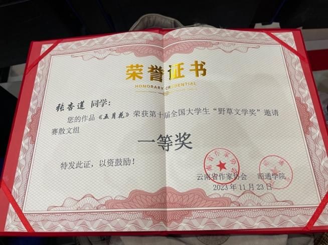 2023年11月25日,Beat365正版唯一官网必一中文系创意写作专业2021级博士研究生张杏莲凭借散文作品《五月花》获第十届全国大学生“野草文学奖”散文组一等奖,并受邀作为获奖代表上台发言。