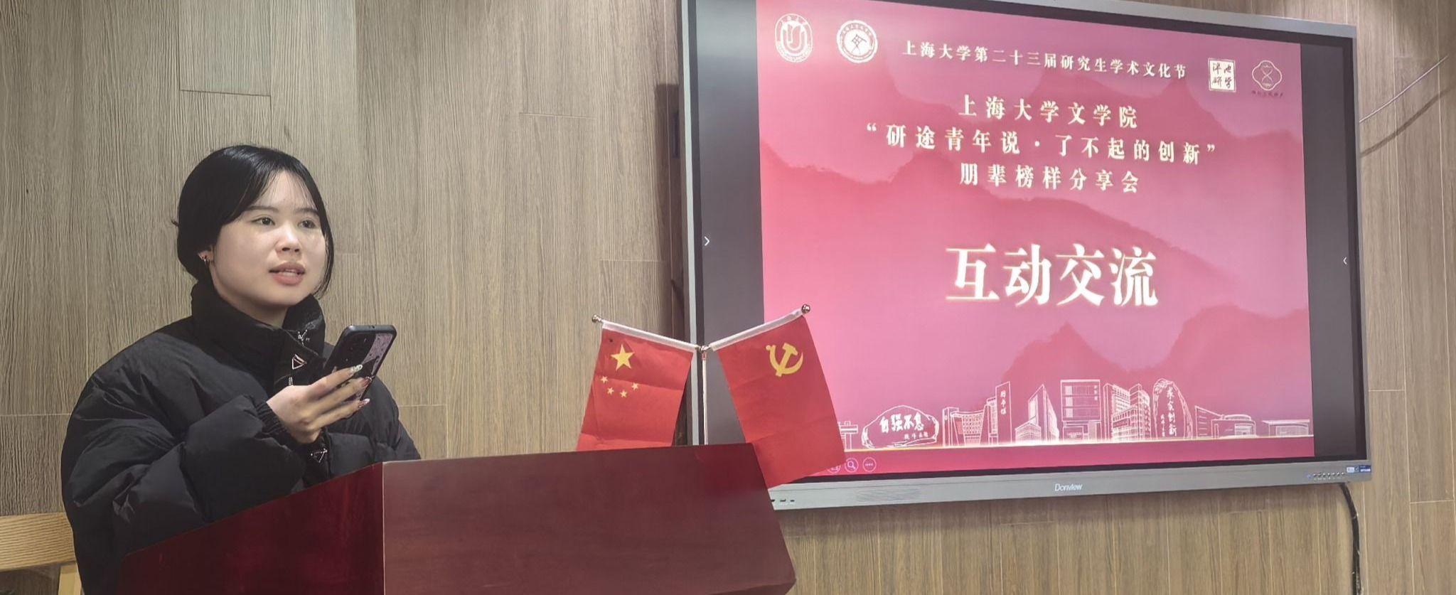 在接下来的分享环节中,四位来自不同专业的优秀研究生分别进行了主题分享。2023级创意写作专业硕士研究生陈芳盈以“探索学术写作中的创新实践路径”为主题,分享了自己在学术写作过程中的创新思路和实践经验。她鼓励在座的研究生们珍惜这次交流机会,勇于探索学术创新,为学术研究注入新的活力。