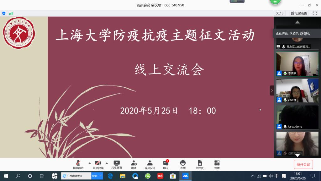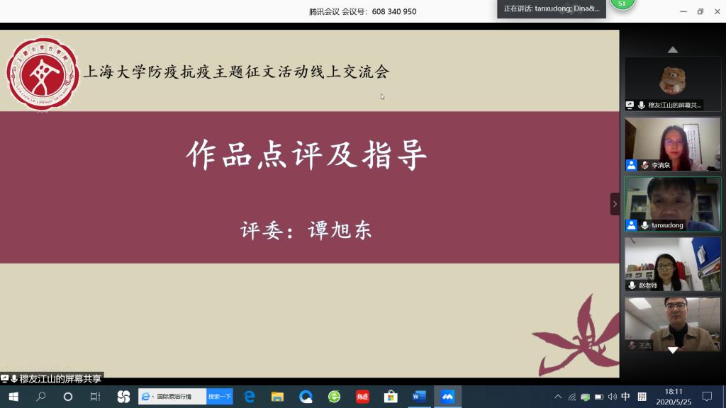 会上,与会老师宣读了获奖名单,并对获奖作品进行了点评。谭旭东教授作为此次活动的发起人,表达了对此次活动的大力肯定,鼓励同学们对生活做出观察与思考,将理论与实践相结合,在疫情期间坚持学习和读写。同时,谭老师对两篇一等奖文章做出了精彩点评,赞赏了同学们对社会现实的敏感度和社会参与意识,对作品中所展现出的善与温度非常感动。汪雨萌老师肯定了同学们对疫情的关注以及用文字记录事件的做法,鼓励大家对生活进行观察和体会,她认为同学们创作的作品能够跳脱典型化、脸谱化的人物,还原生活中普通人挣扎的心理状态,非常值得学习。谢尚发老师肯定了此次征文活动的积极意义。他指出,同学们的作品中,感情充沛,特别是一些古体诗词的创作,非常有创意,并勉励同学们进一步掌握古文中的风骨,保持多读多看多思考的习惯,不断锤炼语言,深化意境。