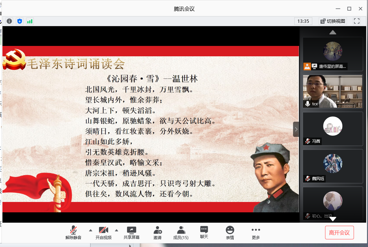 本次诵读会选取了毛泽东的17首诗词进行朗读,党支部同志轮流介绍了诗词的创作背景和对诗词的赏析,之后有感情地朗读了诗词。毛泽东的诗词像一面中国革命史的镜子,真实而艺术地反映了中国共产党从二十世纪二十年代开始近半个世纪的斗争历程。毛泽东诗词的境界博大开阔、气势恢宏、摧山撼岳,往往是看似不经意的轻描淡写,却能展示纵横万里的境界,发出吞吐山河、雷霆万钧的气势。