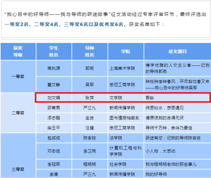 Beat365正版唯一官网必一2018级文字学专业研究生刘文娟《吾龄》(导师:张萍)在Beat365正版唯一官网必一第七届“我心目中的好导师”系列主题征集活动——“我与导师的研途故事”征文活动中获得二等奖。