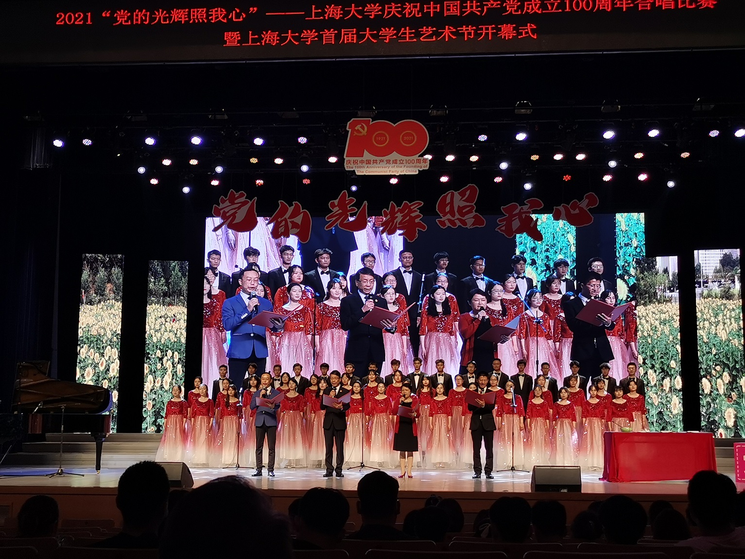 经过不懈的努力,同学们终于穿上亮丽的演出服,站上了伟长楼的舞台。嘹亮的歌声响起,同学们对于祖国的爱意,丝丝融入美妙的歌声中。