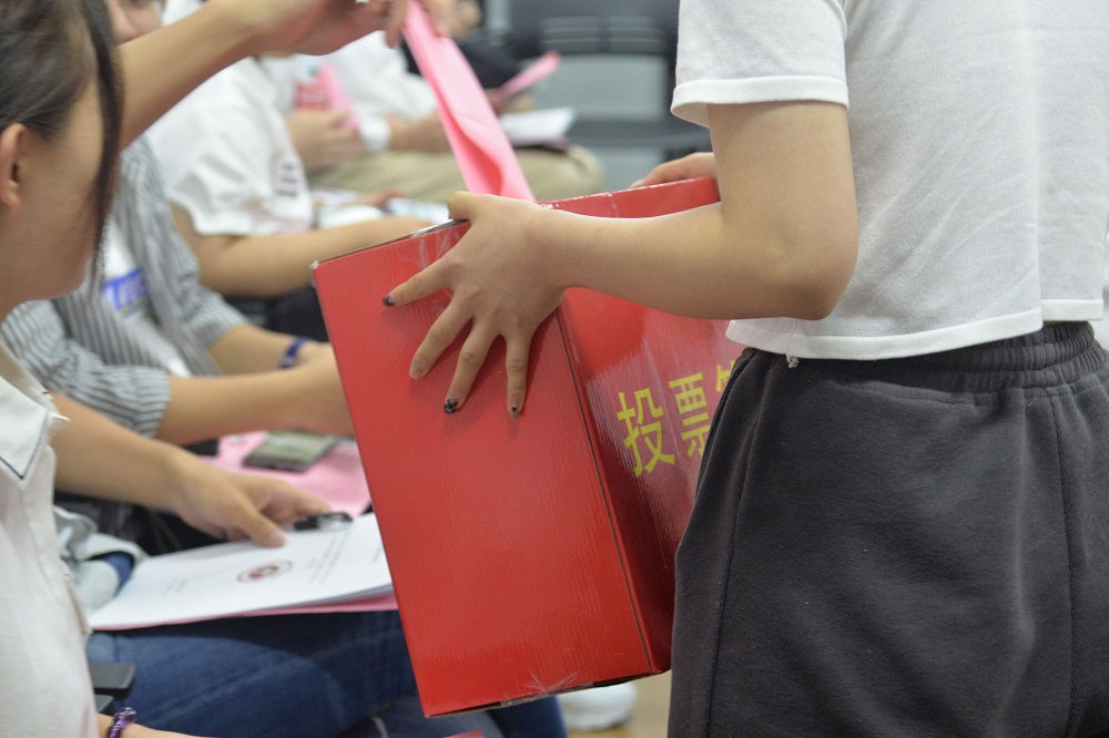 各学生代表本着公平、公正、公开的原则,采取无记名投票方式填写选票,中场休息时,由计票人进行计票。
