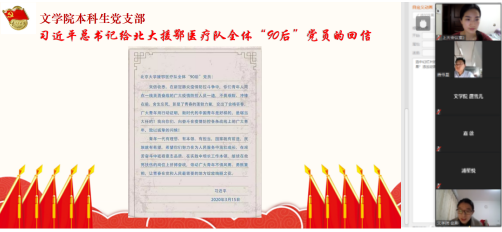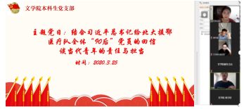3月25日下午,本科生党支部全体党员在zoom平台上开展学习习近平总书记给北京大学援鄂医疗队全体“90后”党员回信精神主题党日活动,部分本科生入党积极分子列席。活动由学院本科生党支部书记梁爽老师主持。